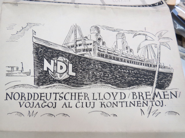 Yksi kieli - yksi mieli -tavoite - uskaltaako näin päätellä? Jo ennen ihannoitua EU-liittovaltiota ajettiin meitä poloisia yhden kielen käyttöön, esperanton piti olla avain kaikkien kansojen harmoniaan ja yhteisymmärrykseen - pieneksi harrastetoiminnaksi jäi, mutta antikvariaatissa voi tällaiseenkin ihmeeseen törmätä - suuren saksalaisen varustamon mainos "A foirola Leipzig"-esitteessä vuodelta 1925.