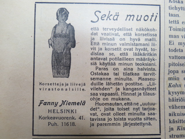 Kaikkia muodin oikkuja ja vaatimuksia noudattavia vaatevarusteita markkinoitiin näin eritoten virkanaisille, ei kai maalaispiiat tämmöisiä tarvinneetkaan? Vai oliko kenties tavoitteena päästä osalliseksi näitten parempiosaisten tilipusseista? Maalaisethan saattoivat nuo vaatekappaleet ommella vaikka käytetyistä jauhosäkeistä ja käytössä olevat rahavaratkin olivat varmasti pieniä.