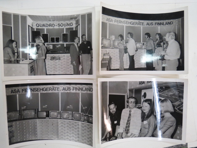 Muisto vain on tämäkin aika, kun Suomesta Saksaan vietiin viihde-elektroniikkaa. Messuosastollakin keikkui neljä henkeä. Laatutietoinen ja -kriittinen saksalaisyleisö tutkailee ASA Quadro-Sound vempeleitä...
