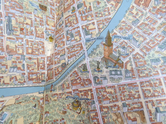 Karttakansio, joka on teetetty Turun kaupungin 750-vuotisjuhliin, sisältää useita (repro)karttoja Turusta vuosien varrelta, tämä yksityiskohta vuoden 1958 matkailukartasta. Taattuja myyntiartikkeleita aina antikvariaatissa, kunhan vain käsiinsä saa. Koko kansiona varmaankin melko harvinainen, kun en ole aikaisemmin runsaan kahdenkymmenen vuoden aikana nähnytkään?