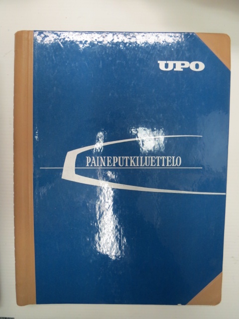 "UPO paineputkiluettelo -talonrakennustoimintaan käytettyjen valurautaisten paineputkien ja niihin kuuluvien muotokappaleitten normit (kv. normien 1951 mukaan)", erinomainen lähdeteos vaikkapa putkistoremonttien suunnittelijoille tai keille tahansa alasta kiinnostuneille - huomaa kansion ulkoasu, jostain käsittämättömästä syystä teos on sidottu puoliranskalaisella sidoksella aidolla nahalla - on siinä sodasta toipuvalla suomalaisella rakennusteollisuudella ollut katteet ja voitelurahat kohdallaan, että on voitu tällainen sidosasu työmaakäyttöön kustantaa! Toinen vaihtoehto voisi toki olla, että nahantuotannossa (maataloustoimintaa) on ollut jo tuolloin havaittavissa vuotavuoret, jotka on johonkin täytynyt tunkea.