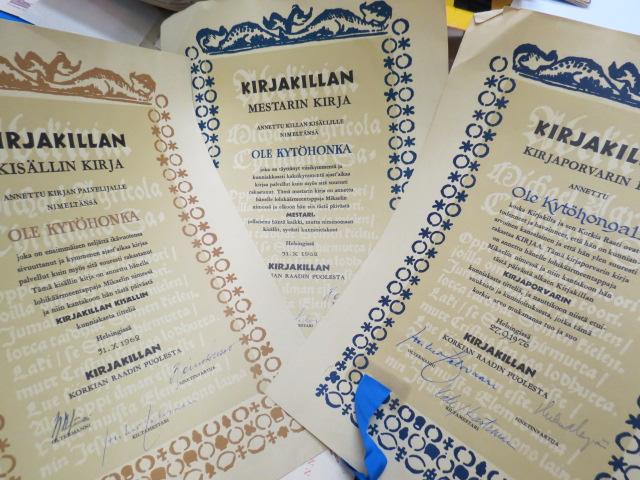 Kirjakisälli - Kirjamestari - Kirjaporvari - tasainen on ollut kehityskulku aikoinaan kirjakauppa-alalla, nämä myöntökirjat annettu aikoinaan Porilaiselle Ole Kytöhongalle ansioistaan. Kisällinkirjakin ihan lohikäärmeentappaja Mikaelin nimessä. Tässä toki kyseessä uusien kirjojen ala.