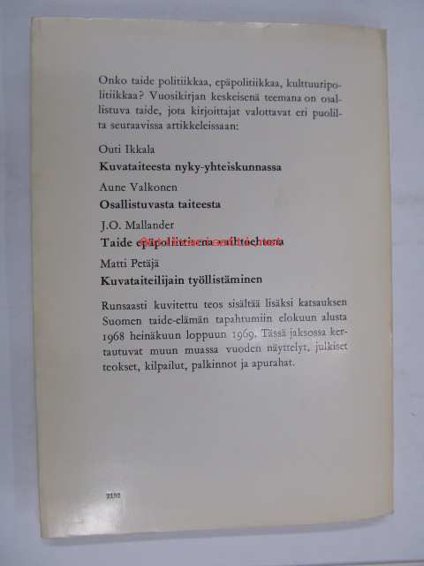 | Saatavilla | 1 kpl | | Julkaisuvuosi | 1969 | | Sivuja | 161 | | Painos | 1. | | Kunto | K3 | | Sidonta/painoasu | Nidottu (pehmeäk.) | | Kielet | Suomi |