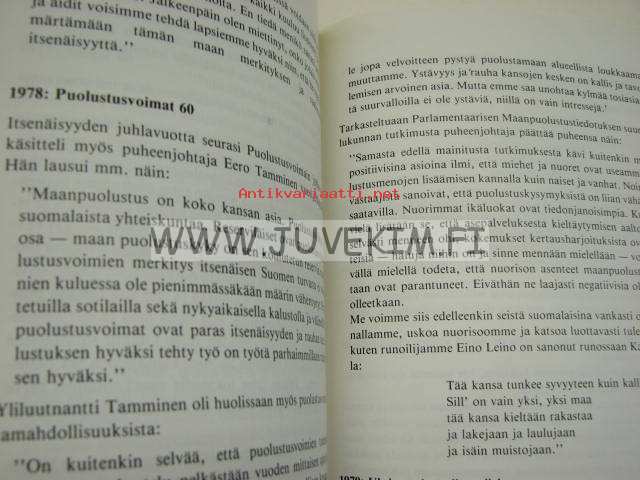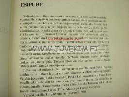 | Saatavilla | 1 kpl | | Julkaisuvuosi | 1980 | | Sivuja | 135 | | Painos | 1. | | Kunto | K3 | | Liimasidos irti kannesta | | Sidonta/painoasu | Nidottu (pehmeäk.) | | Kielet | Suomi |