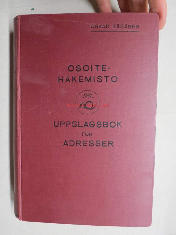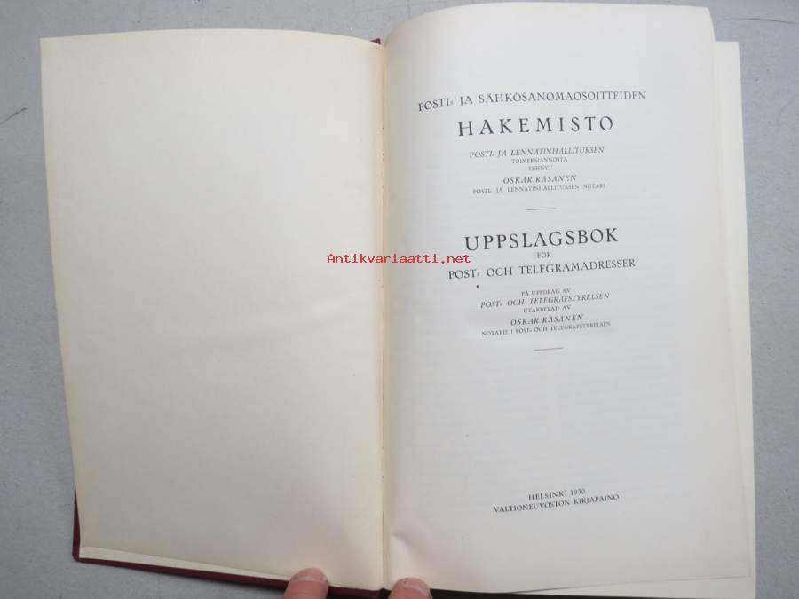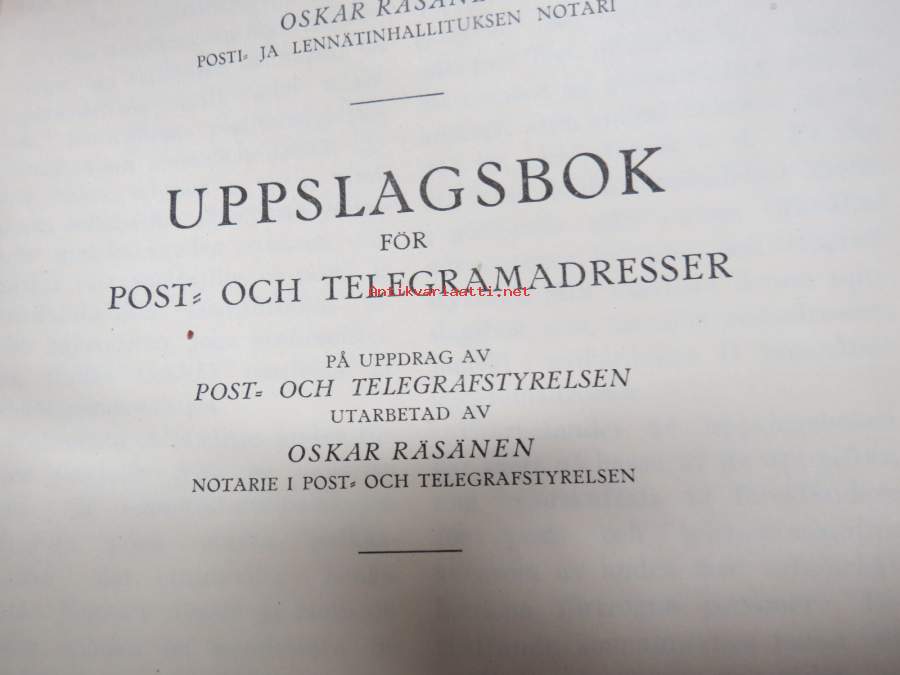 Oskari Räsänen, Posti- ja lennätinhallitus, 1930Posti- ja lennätinlaitoksen osoitehakemisto - Post- och telegrafverkets adressförteckning -erinomainen hakuteos paikkakuntien, kylien, talojen, teollisuuslaitosten jne. nimien ja sijaintien selvittelyyn, 19 x 25 cm.