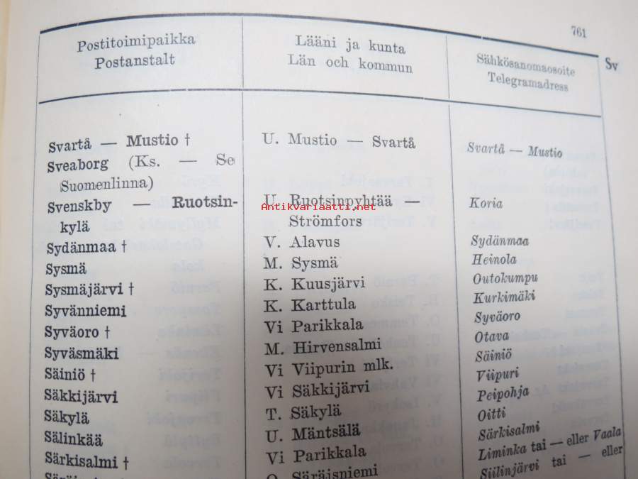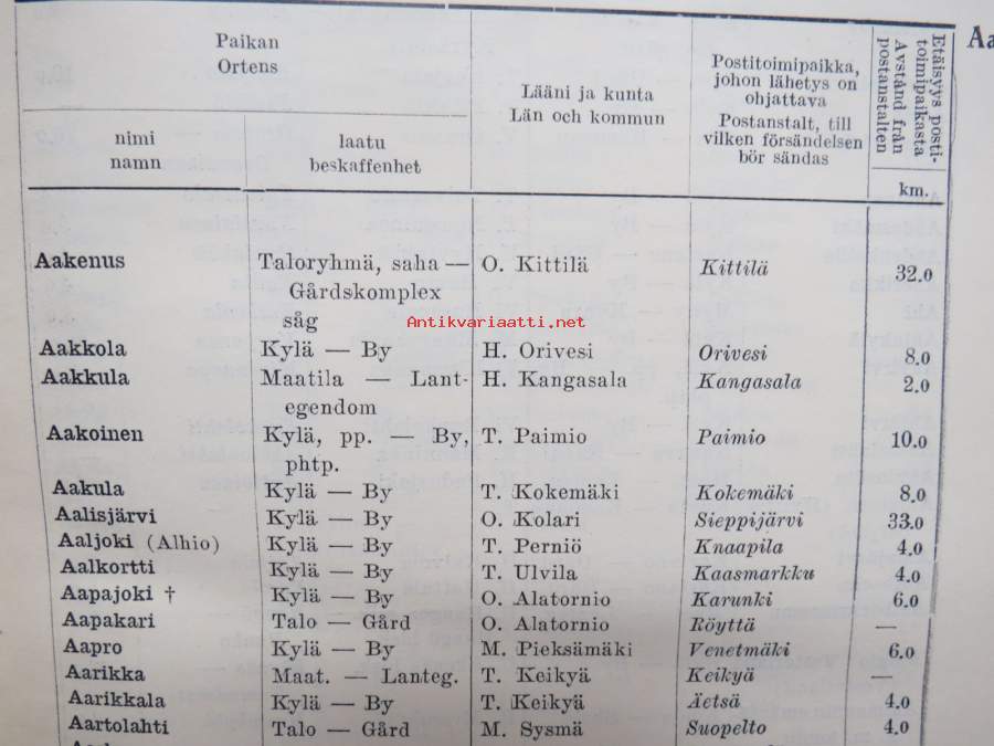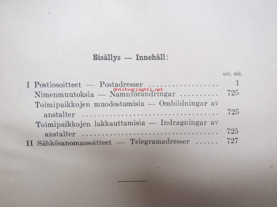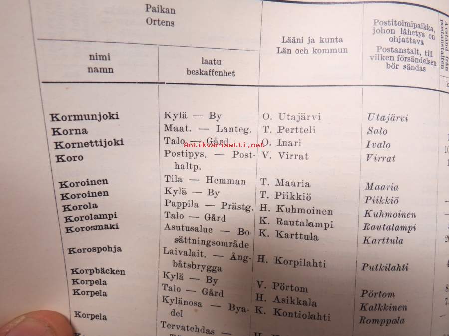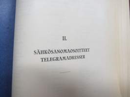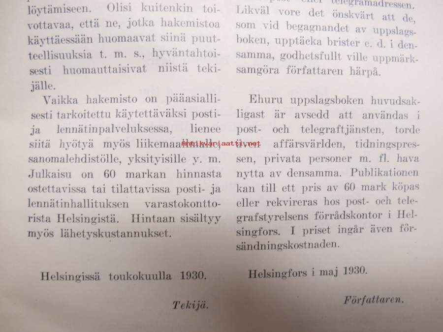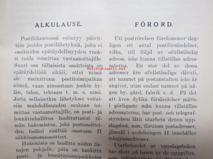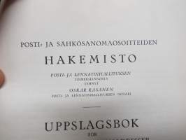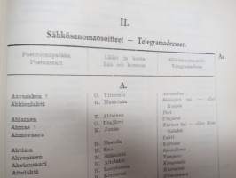 Posti- ja lennätinlaitoksen osoitehakemisto 1930 - Post- och telegrafverkets adressförteckning -erinomainen hakuteos paikkakuntien, kylien, talojen, tehtaiden jne.