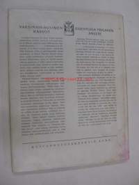 | Saatavilla | 1 kpl | | Julkaisuvuosi | 1947 | | Sivuja | 85 | | Painos | 2. | | Kunto | K3 | | Sidonta/painoasu | Sidottu (kansipaperit) | | Kielet | Suomi |