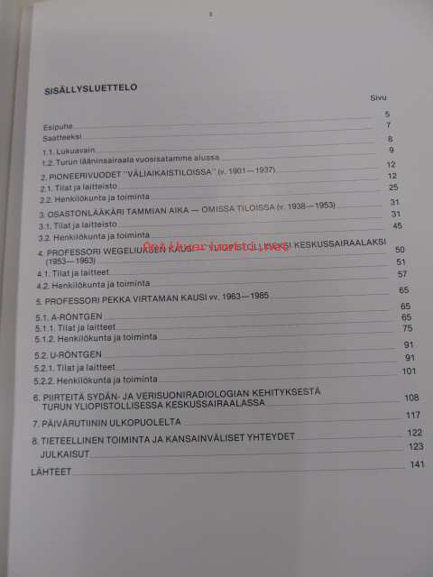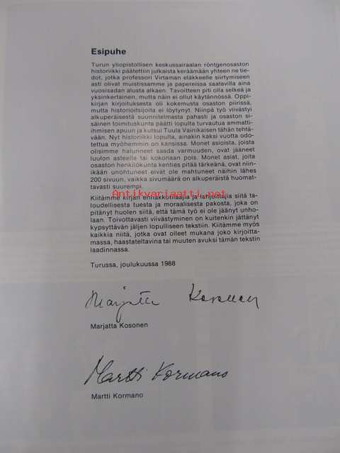 | Saatavilla | 1 kpl | | Julkaisuvuosi | 1989 | | Sivuja | 142 | | Painos | 1. | | Kunto | K3 | | Sidonta/painoasu | Sidottu (kovak.) | | ISBN | 951-95272-7-3 | | Kielet | Suomi |