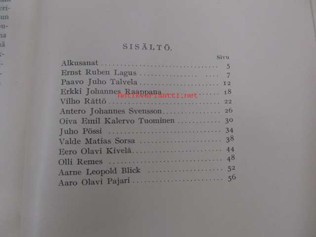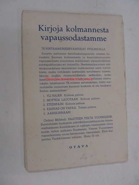 | Saatavilla | 1 kpl | | Julkaisuvuosi | 1941 | | Sivuja | 60 | | Painos | 1 | | Kunto | K3 | | Sidonta/painoasu | Nidottu (pehmeäk.) | | Kielet | Suomi |