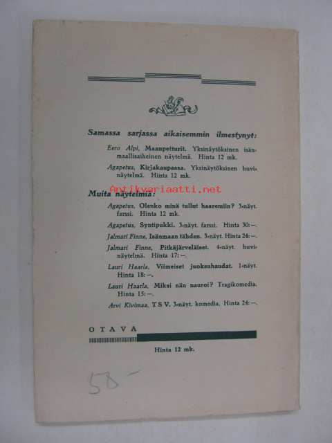 Saatavilla 1 kpl Julkaisuvuosi 1931 Sivuja 80 Painos 1. Kunto K2 Sidonta/painoasu Nidottu (pehmeäk.) Kielet Suomi