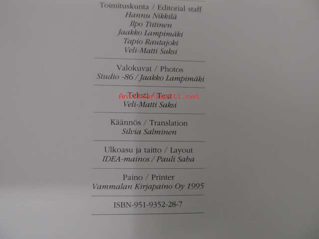 Saatavilla 1 kpl Julkaisuvuosi 1995 Sivuja 109 Painos 1. Kunto K4 Sidonta/painoasu Nidottu (pehmeäk.) ISBN 951-9352-28-7 Kielet Suomi