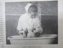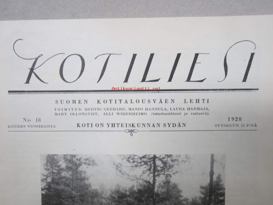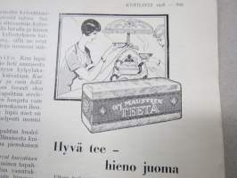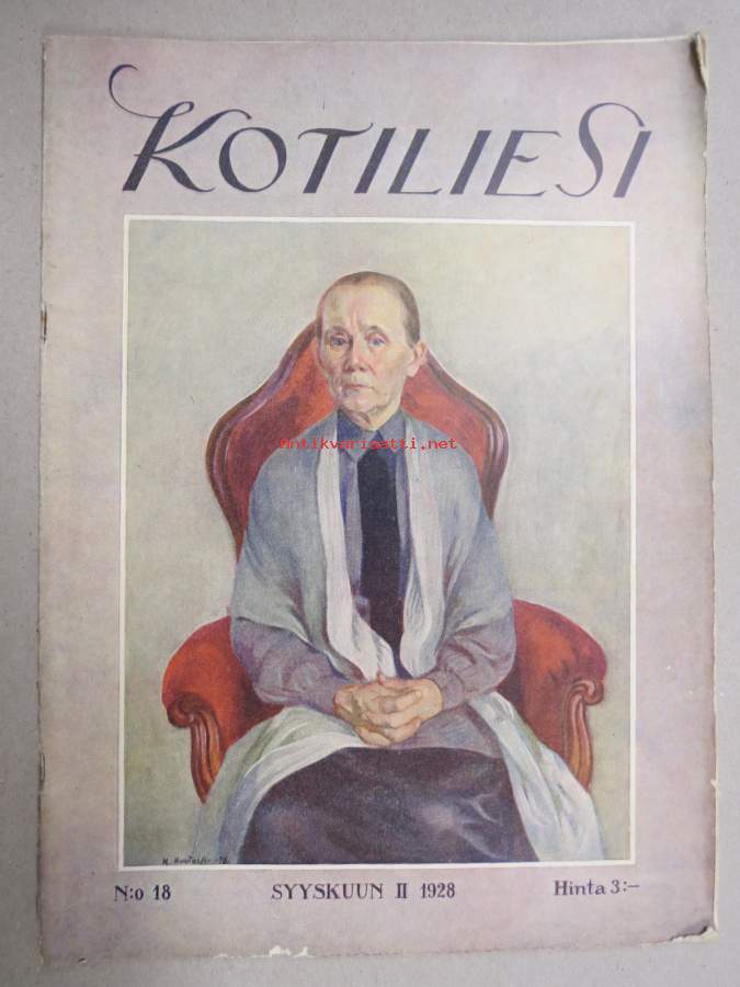 Kotiliesi 1928 nr 18, Kansikuva K. Kuutola - Vanha äiti, Suomalaisia maalaistaloja mm Untamala Laitila - Kanajärvi Kalvoila, Vastasyntyneiden kylvettäminen...