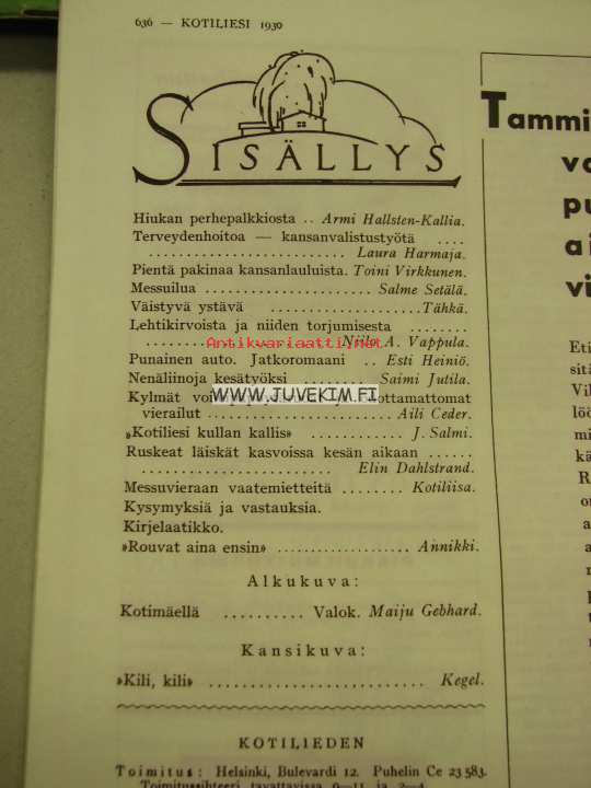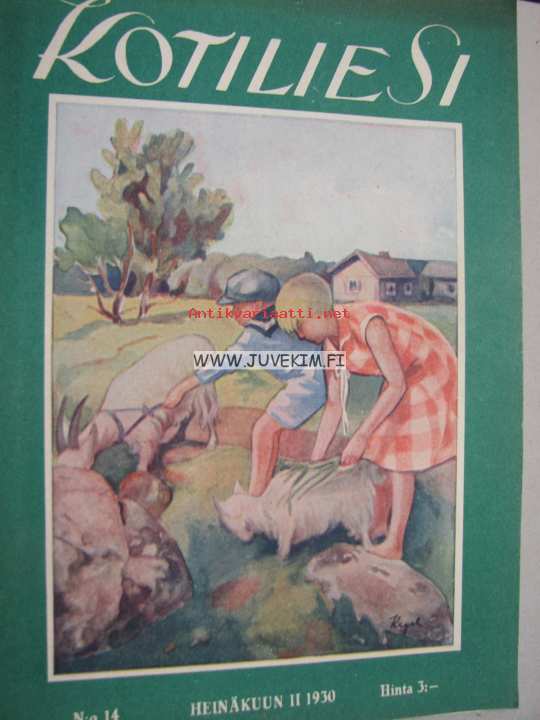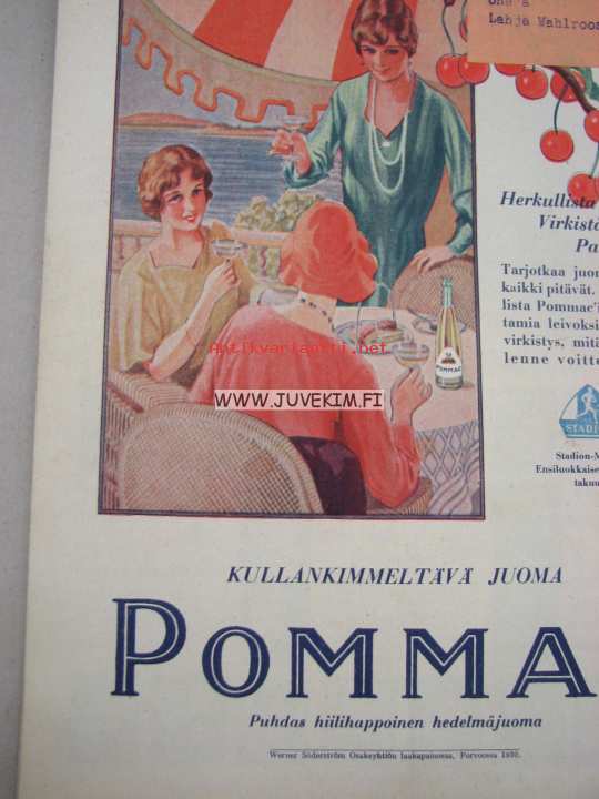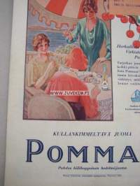 Kotiliesi 1930 nr 14, 15.7. heinäkuu II numero, Dresdenin hygieninen näyttely, Noormarkku - Katriina Ihanakangas, Takannessa värikäs Pommac-mainos, Huonekalumessut