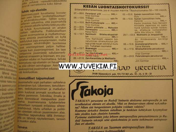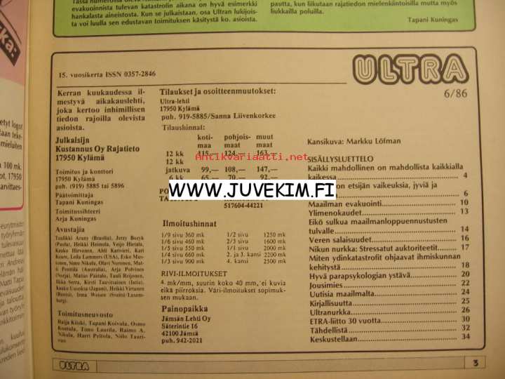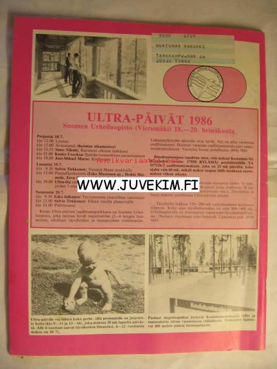 | Saatavilla | 0 kpl (Huom. tuote on myyty! / Sold out!) | | Julkaisuvuosi | 1986 | | Kunto | K3 | | Sidonta/painoasu | Lehti | | ISBN | 866202-6-06 | | Kielet | Suomi |