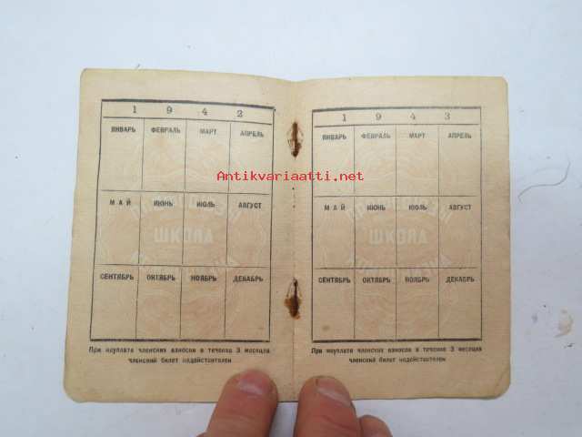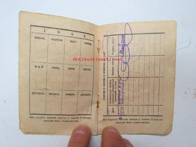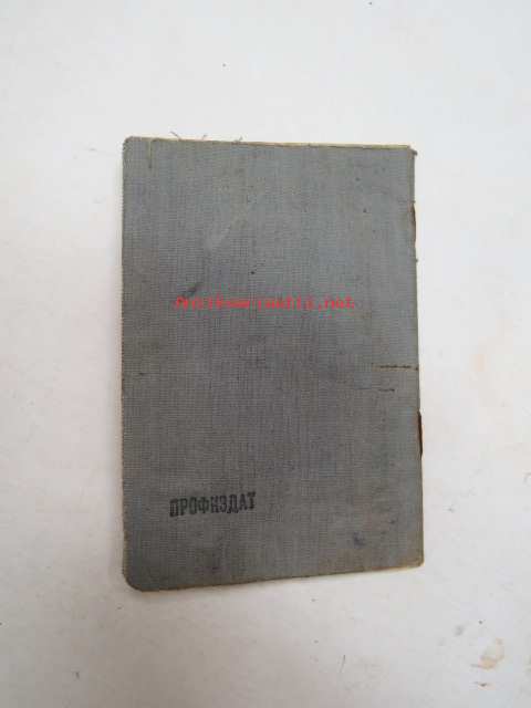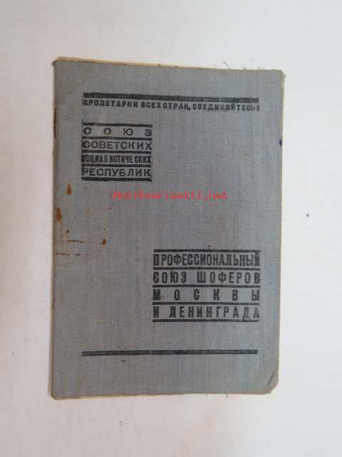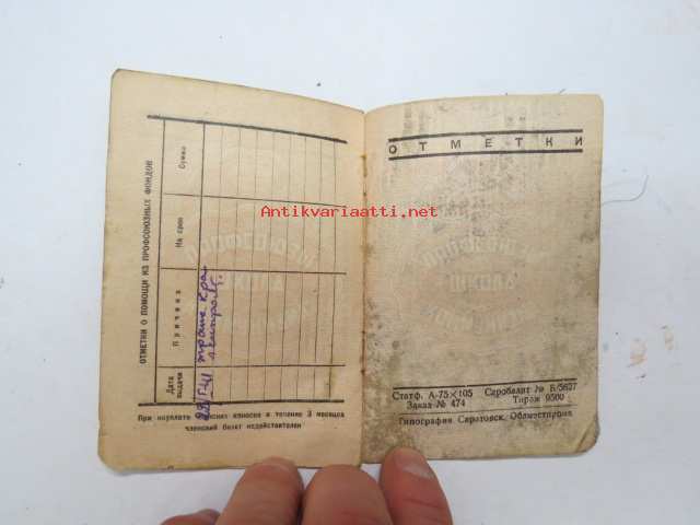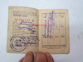 7 x 11 cm. Ammattiautonkuljettajien ammattiliiton Moskovan ja Leningradin alueen jäsenen jäsenkirja. Muutamia paperisia maksu- tai leimamerkkejä suoritetuista maksuista.