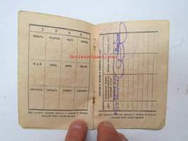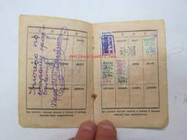 Neuvostoliiton Ammattiautoilijoiden Liiton jäsenkirja 1930-luvun loppu, joitakin leimamerkkejä