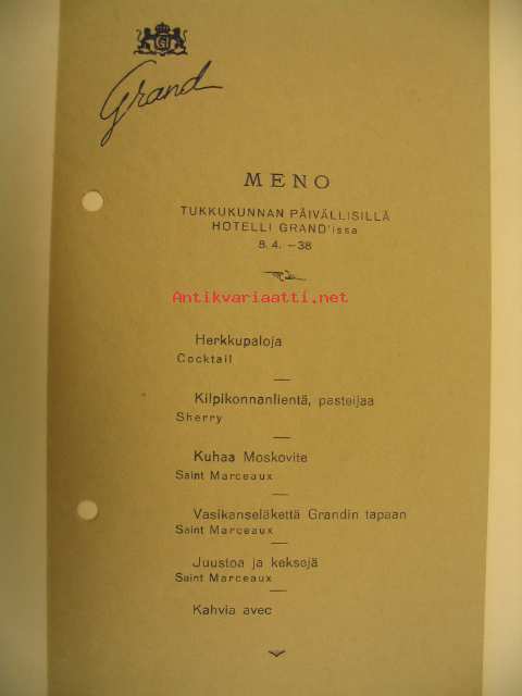 Hotelli Grand Menu Tukkukunta päivälliset 8.4.1938