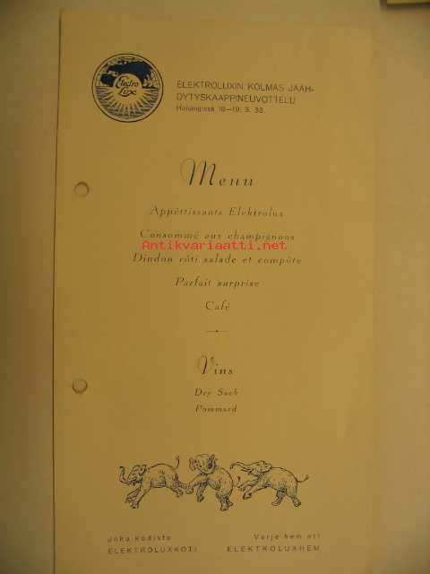Hotelli Grand menu Electroluxin kolmas jäähdytyskaappineuvottelu Helsingissä 18-19.3.1938