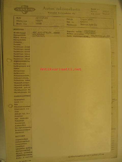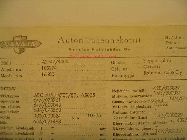Vanaja kuorma-auton rakennekortti A2-47/4300 10.3.1966