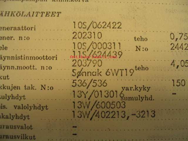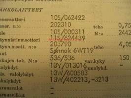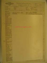 Alusta nro 185274, moottori nro 16580, ostaja seppo Lehto, Orivesi. Kortti siosältää kaiken teknisen tiedon asennuksista ja osista.
