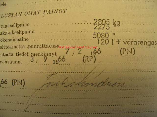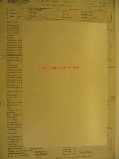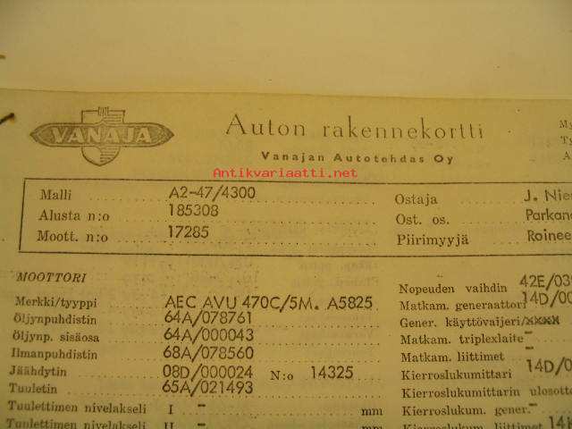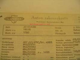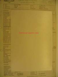 Alusta nro 185308, moottorin numero 17285, ostaja J. Niemistö Parkano. Kortissa on kaikki tekniset tiedot asennuksista ja osista tehtaalta luovutettaessa.
