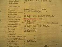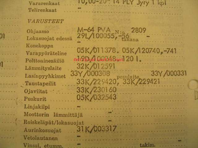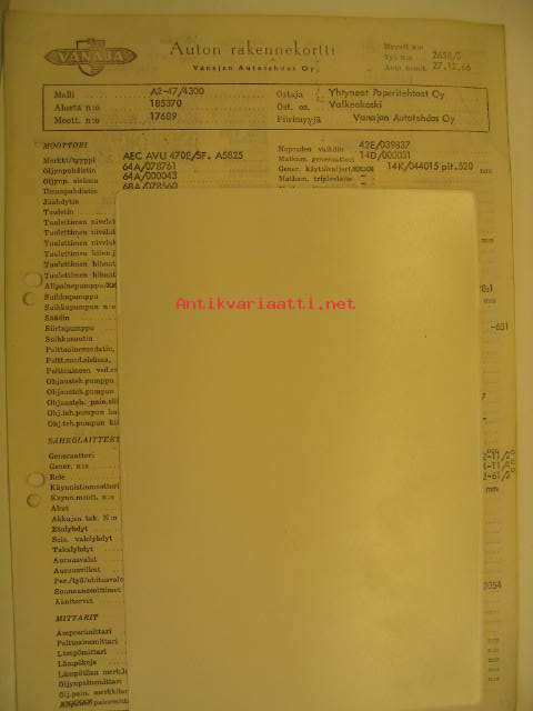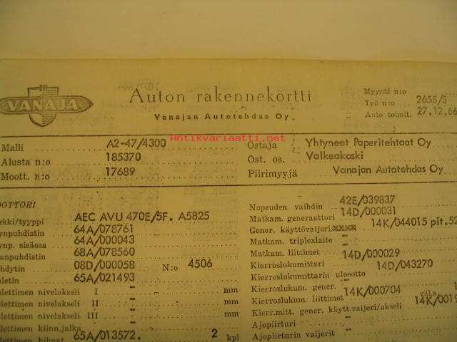Alusta nro 185370, moottori nro 17689, ostaja Yhtyneet Paperitehtaat Oy Valkeakoski. Kortissa on kaikki tekniset tiedot osista ja asennuksista tehtaalta toimitettaessa.