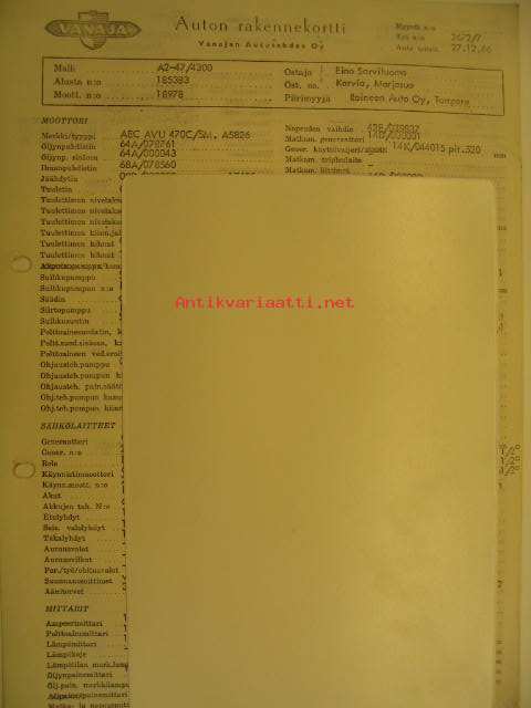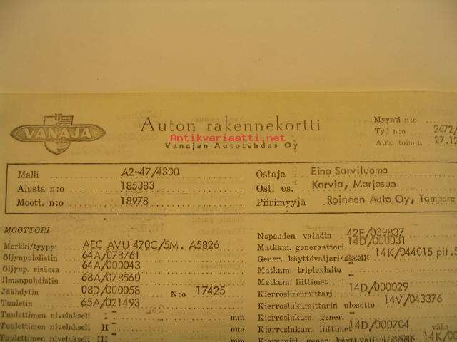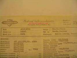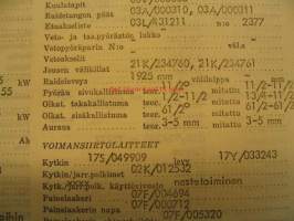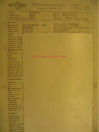 Alusta nro 185383, moottori nro 18978, ostaja Eino Sarviluoma Karvia. Kortissa on kaikki tekninen tieto osista ja asennuksista tehtaalta luovutettaessa.