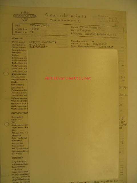 Vanaja kuorma-auto rakennekortti VLK4-60/6000 9.4.1965 Väinö Paunu
