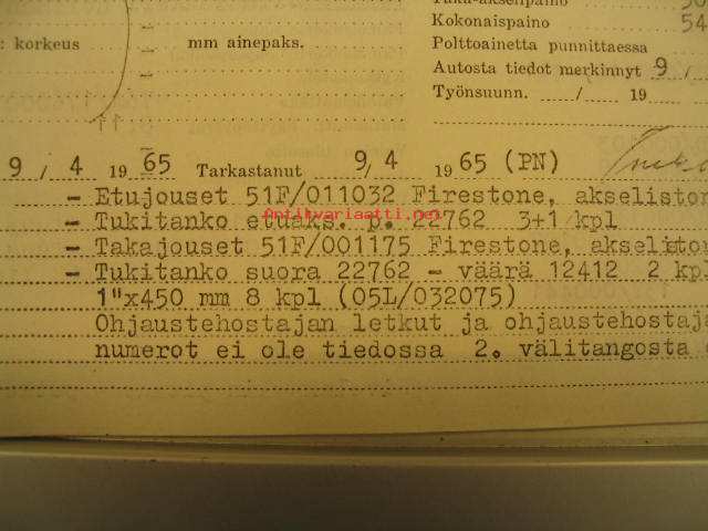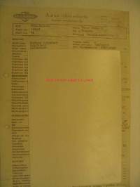 Alusta nro 186501, moottorin numero 14. Ostaja Väinö Paunu Oy. Kortissa on kaikki tekniset tiedot osista ja asennuksista tehtaalta luovutettaessa.