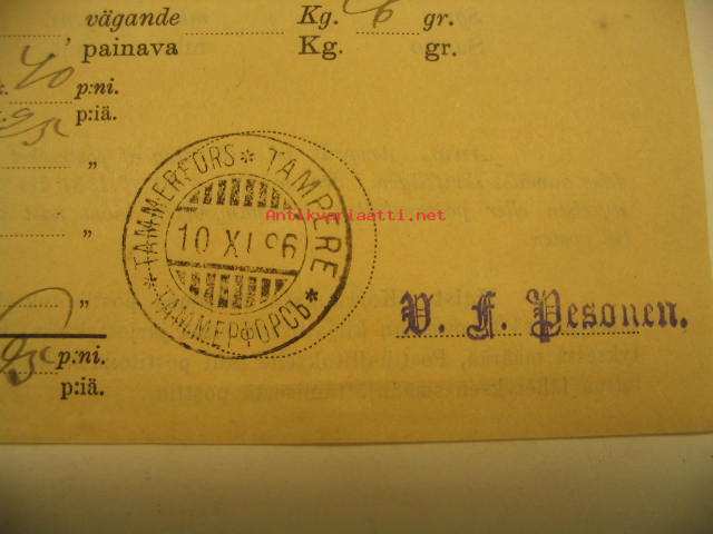 Kirjattu kirje lähetyskuitti 10.11.1896 Tampere