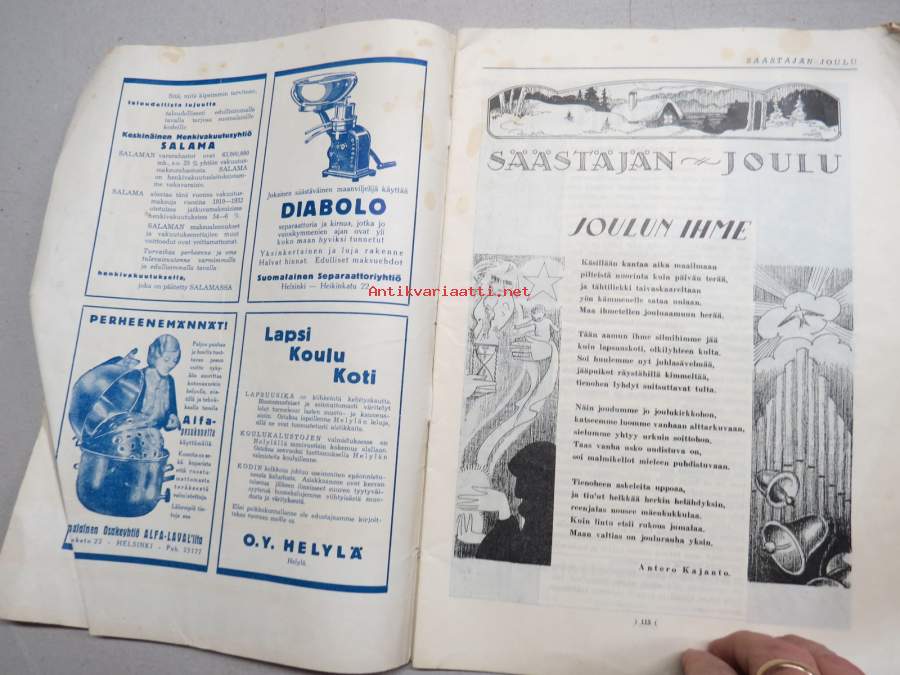 Säästäjän Joulu 1933 -joulunumero, Kansikuvitus Doris Lindh, Heikki Asunta, Thomas alva Edison, Dagapajun vaurastuminen, Tulipalo Nukkelassa, Nille Mesiläinen, ym.
