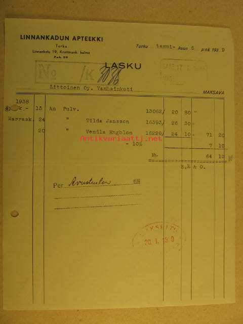 Littoinen Oy:n vanhainkodin tilaamat lääkkeet.