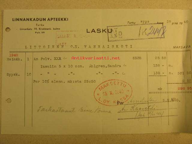 Linnankadun Apteekki lasku 30.9.1940