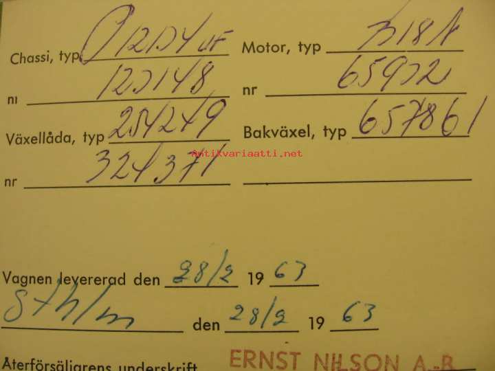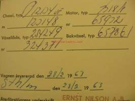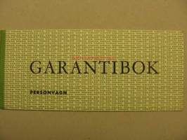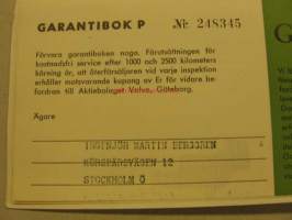 Noin 9 x 20 cm takuuvihko, joka kirjoitettu autoa toimitettaessa v. 1963. Ostajan ollut insinööri Martin Berggren Tukholmassa, takuu tai muihin asioihin liittyviä kupunkeja irroitettu. Siisti kappale. Hyvää rekvisiittamateriaalia esim. hanskalokeroon!