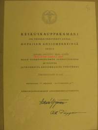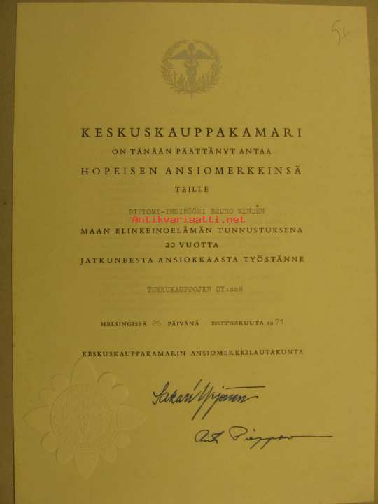 Keskuskauppakamarin hopeinen ansiomerkki myöntökirja