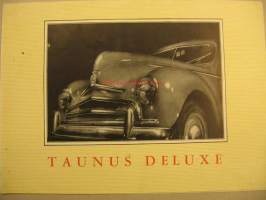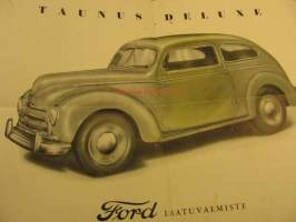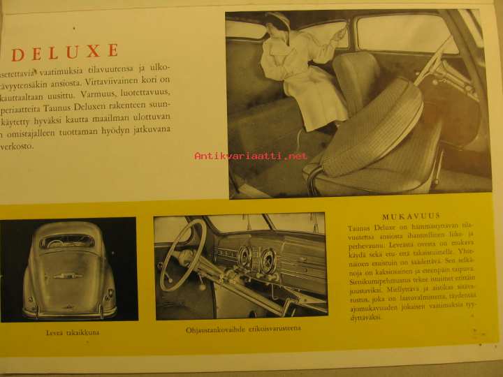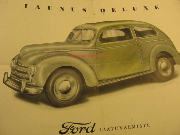 A-4 kokoisesta julisteeksi aukeavamyyntiesite. Ei merkittyä paino- eikä mallivuotta. Asiantuntijalta kysyttyäni kyseessä on todellakin vuosimalli 1950. Lähes samannäköinen oli tuotannossa jo ennen sotaa vv.39-41. Sodan jälkeen tuli tuotantoon mallinimellä Standard, tämä Deluxe on siis mallia -50, suraava eli -51 on yksiosaisella tuulilasilla.