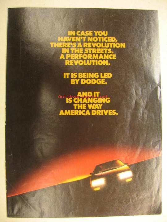 A-4 kokoinen erikoinen Dodge-autojen "performance revolution" eli tehovallankumousesite. Erikoista tässä on, että myös Dodge Omni eli suomalaisittain Horizon on otettu tähän mukaan. Myös Carroll Shelby on valjastettu tähän kehitystyöhön, esitteen takakannessa kuva hänestä.