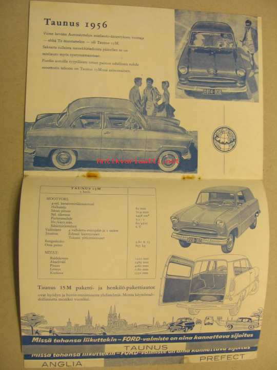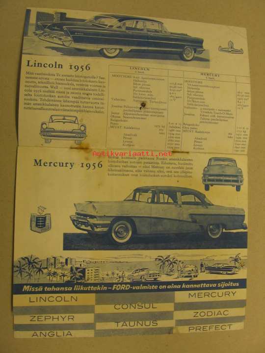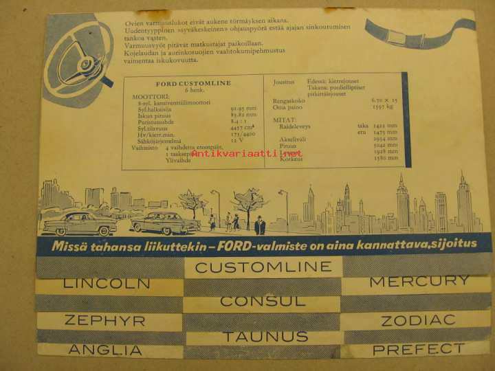 Noin 16 x 21 cm myyntiesite, joka kattaa kaikki Fordin henkilöautomallit vuonna 1956.