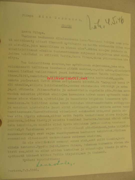 Kauko Kulan yksityiskirje piispa Eino Sormuselle 1946