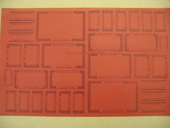 Etikettiarkki Uudenkaupungin Apteekki. Punainen paperi. Leikkaamaton arkki Uudenkaupungin Apteekin etikettejä.