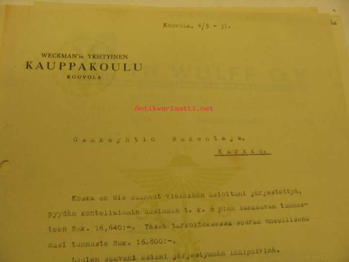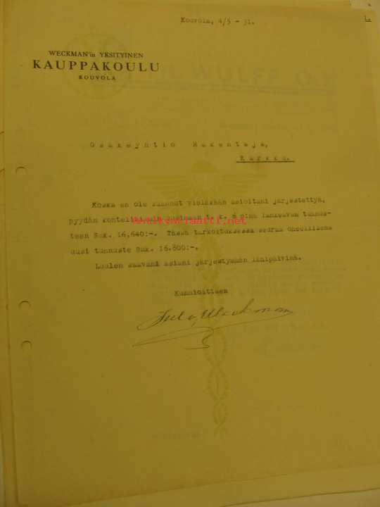 Weckman´in yksityinen Kauppakoulu Kouvola -asiakirja 4.5.1931