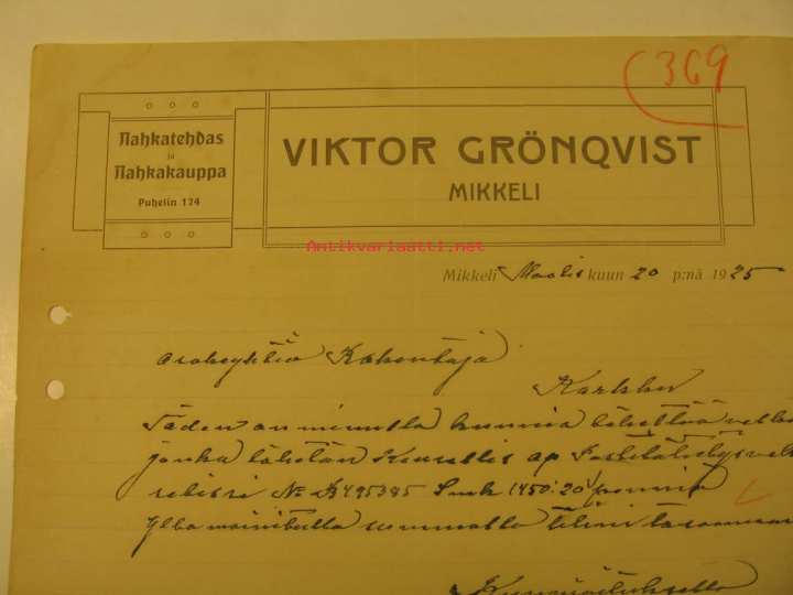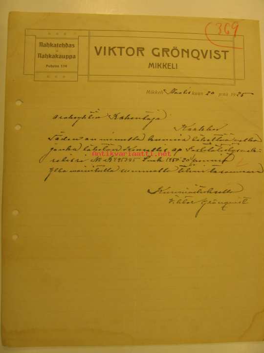 Nahkatehdas ja Nahkakauppa Viktor Grönqvist Mikkeli 20.3.1925 -asiakirja