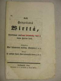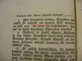 | Saatavilla | 1 kpl | | Julkaisuvuosi | 1860 | | Sivuja | 8 | | Kunto | K3 | | Kielet | Suomi |