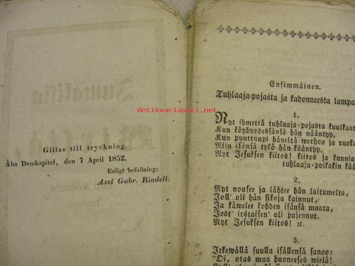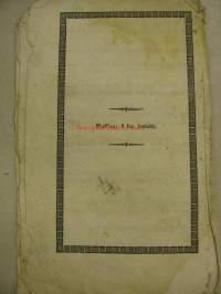 | Saatavilla | 1 kpl | | Julkaisuvuosi | 1852 | | Sivuja | 16 | | Kunto | K3 | | Kielet | Suomi |