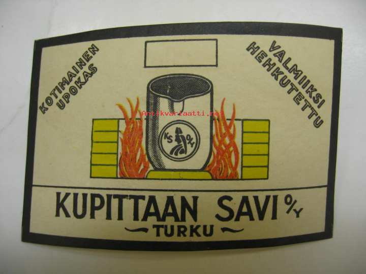 Noin 5 x 8 cm Kupittaan Savi Oy:n valmistaman metallivalimoiden käyttämien upokkaiden mainosetiketti, liimattava, saattanut olla myös kirjeensulkija tai kirjemainosmerkki.