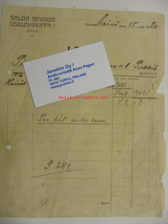 Salon Seudun Osuuskauppa -asiakirja 15.7.1920