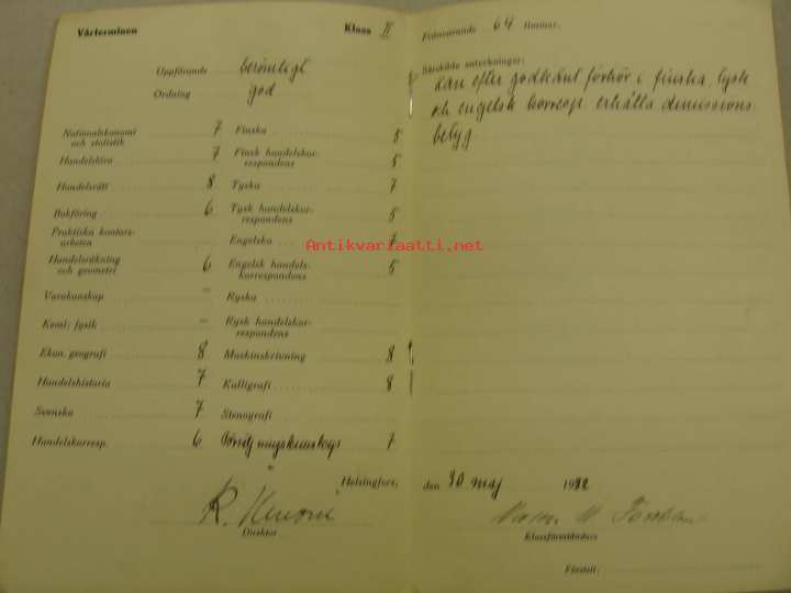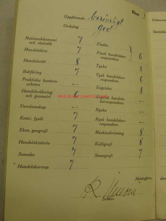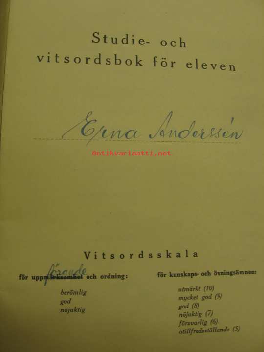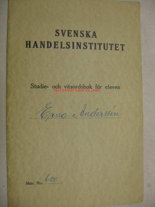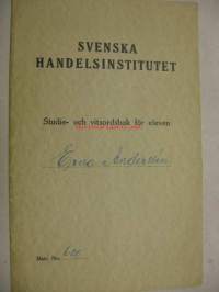 Svenska Handelsinstitutet Studie- och vitsordsbok för eleven Erna Anderssén