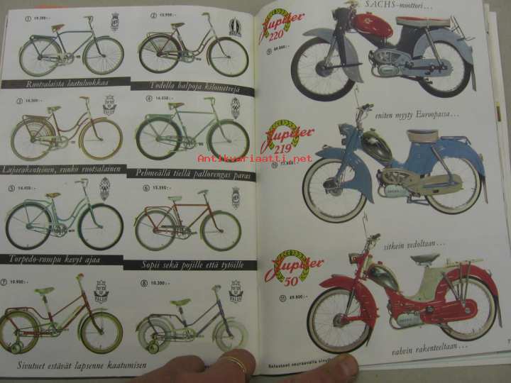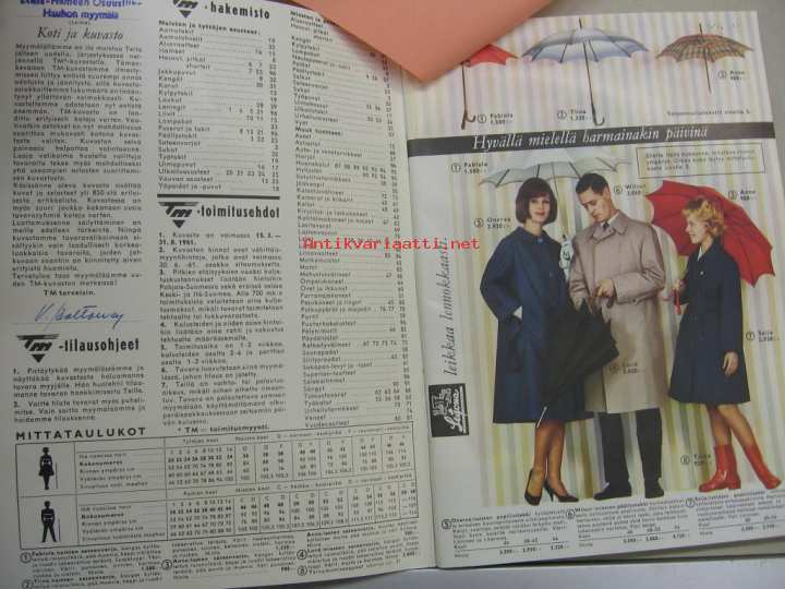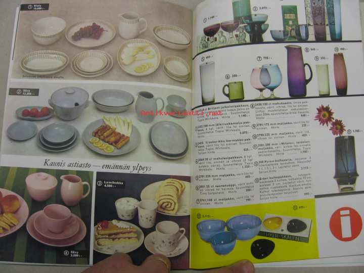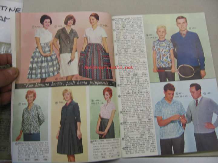Postimyyntiluettelo, josta saat kuvan tuon ajan elämästä. Ja monia aikakautta valaisevia yksityiskohtia; Nykyään lähes jumalalliseen asemaan kohotetun Tapio Wirkkalan tuotteita, esim 200 mm "Milano" taidelasia, myytiin arkisesti postitse. Ja luettelostahan sai tilattua sokealle ja kuurolle papalle vaikka mopon kun ei se enää muuten päässyt kylille liikkumaan.