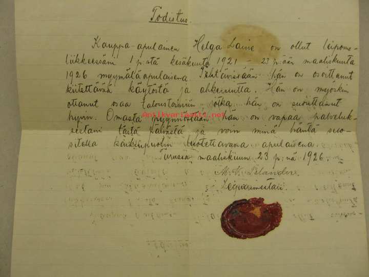 Työtodistus Helga Laine leipurimestari Pelanderilta 1926