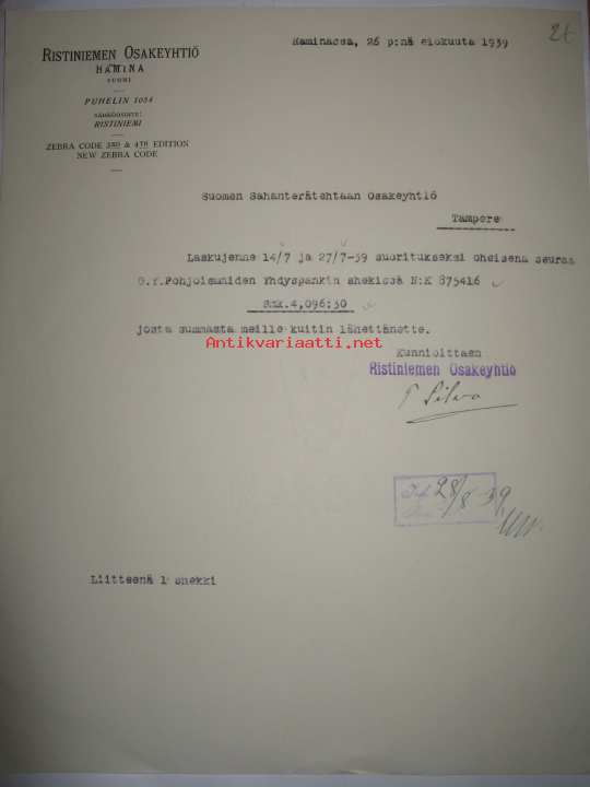 Ristiniemen osakeyhtiö, Hamina 26.8 1939 asiakirja